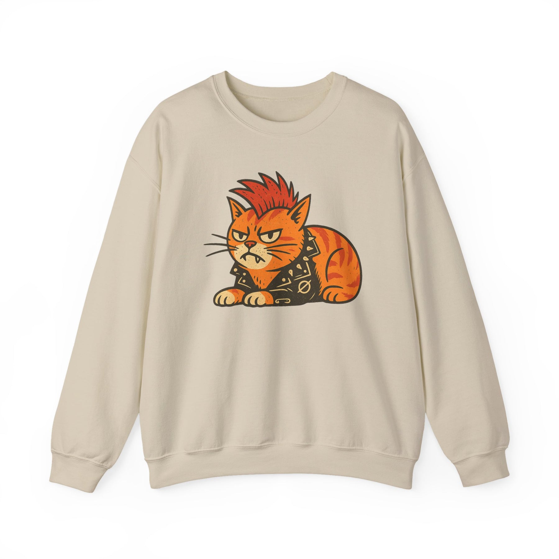 This crewneck brings a cheeky, rebellious edge to quiet days and city nights. Soft yet sturdy, it wears like a trusted companion — cozy at dawn coffee runs, bold enough for weekend meetups, and comfortable for long evenings at home. The front art shows a moody, punk-styled cat with a spiked tuft and leather jacket attitude. It reads like a private joke between kindred spirits: a little grumpy, a lot loyal. The medium-heavy cotton-poly blend keeps shape and warmth while the clean crew neckline and double-needle stitching stand up to frequent wear. Wear it when you want low-key warmth with a wink of mischief — a familiar layer for people who prefer personality over polish.