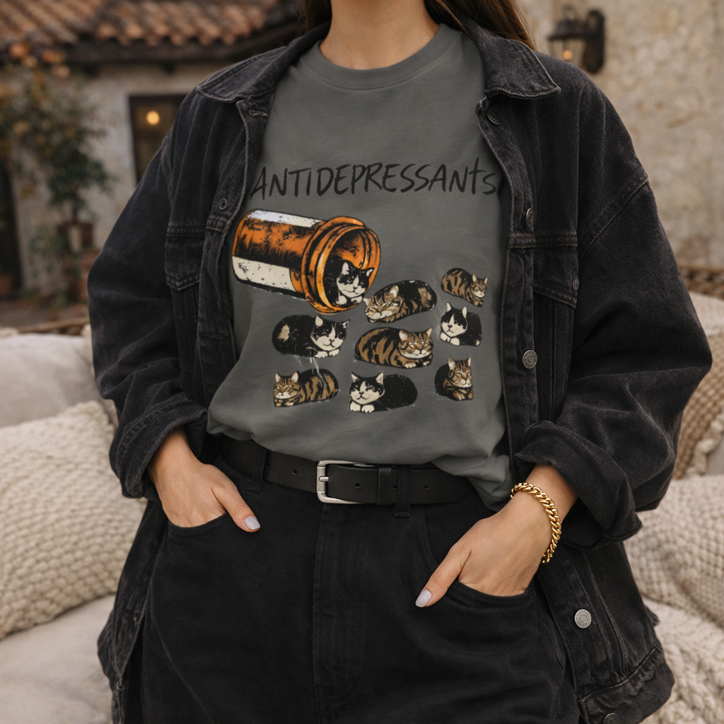 This heavyweight garment-dyed tee carries a raw, honest vibe — a charcoal canvas with a hand-drawn illustration of an overturned pill bottle and scattered capsules labeled “ANTIDEPRESSANTS.” It reads like a quiet, wry statement: worn by someone who navigates mental-health conversations with dark humor and authenticity. The soft, garment-dyed cotton wears in rather than out, gaining a lived-in texture that sits comfortably on relaxed shoulders. It’s the kind of shirt you pull on for late-night city walks, coffee-shop confessions, or low-key meetups with people who get your language. Subtle distress in the print and the deep muted color keep the look grounded and personal, not loud. Built to last, the tee keeps its shape with double-needle seams and a sewn-in label that won’t scratch, so the story it tells becomes part of your everyday rotation.