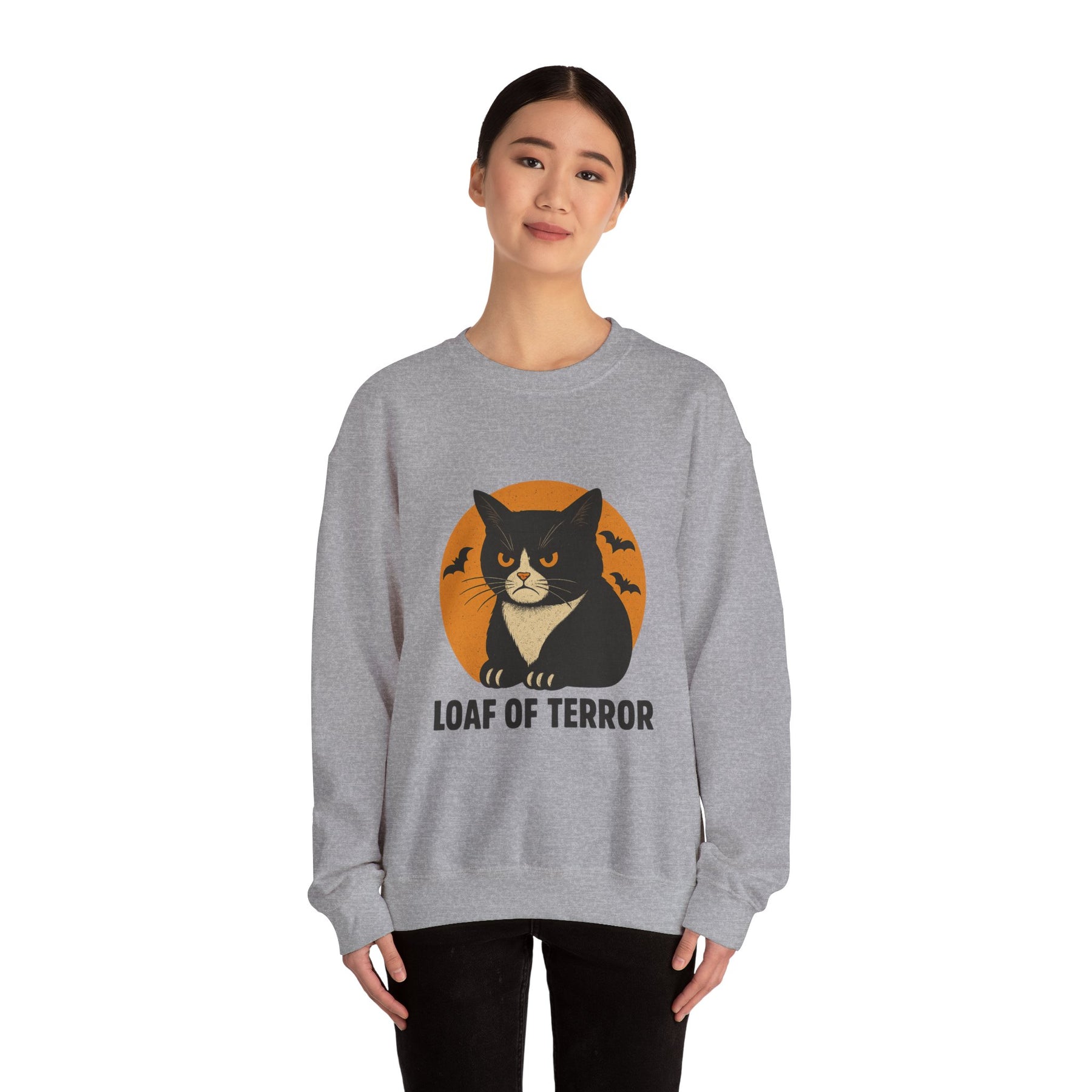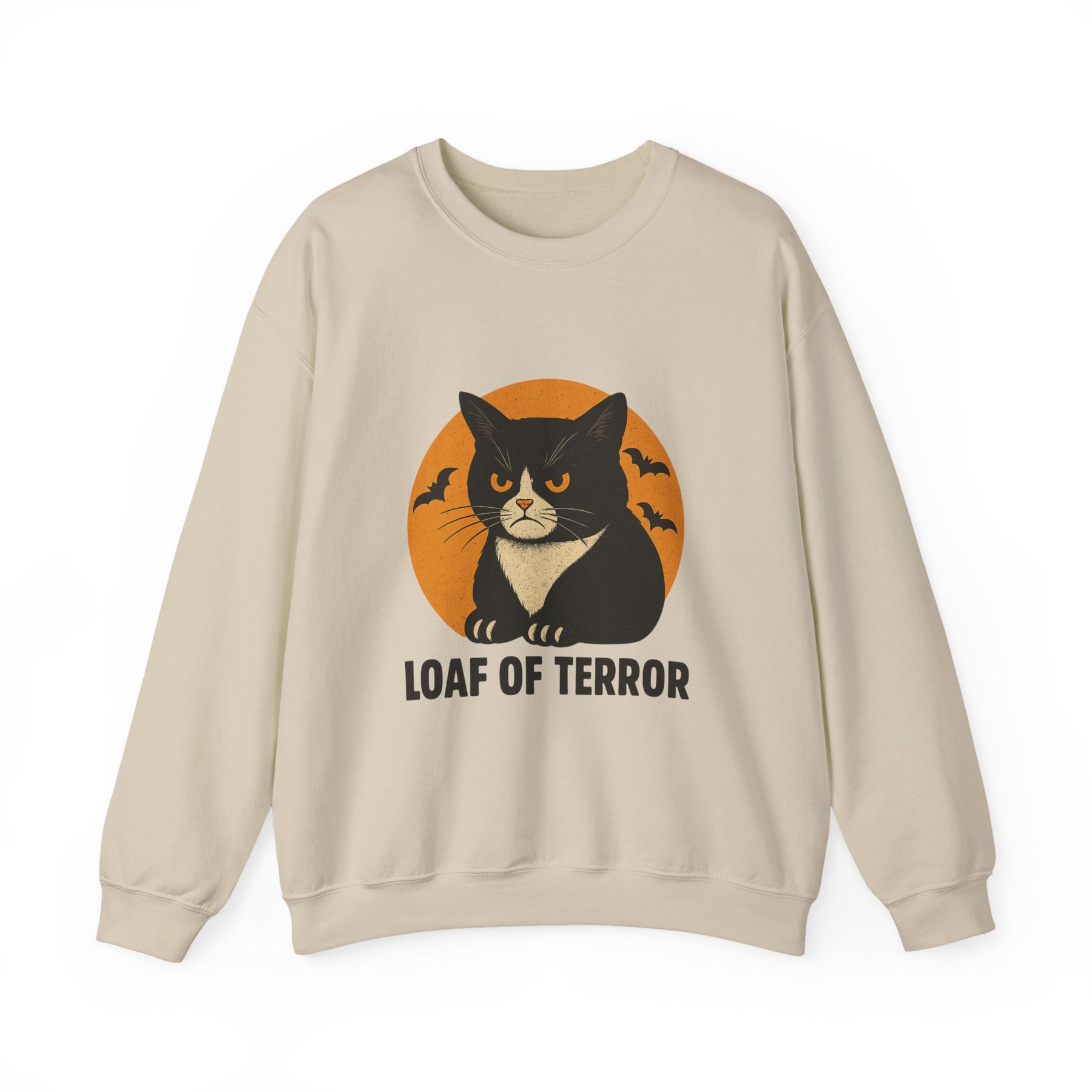 Wrap yourself in cozy dread with the Loaf of Terror Crew Neck Sweater, the perfect mashup of feline chill and eerie style. This design reimagines the beloved “cat loaf” pose with a haunting twist: your favorite loafing cat, shaded in moody tones with subtle ghostly accents, sits framed by vintage horror-inspired semi-circular typography. The “Loaf of Terror” lettering arches over or under the design in distressed style, giving the look a timeless, worn-in feel.