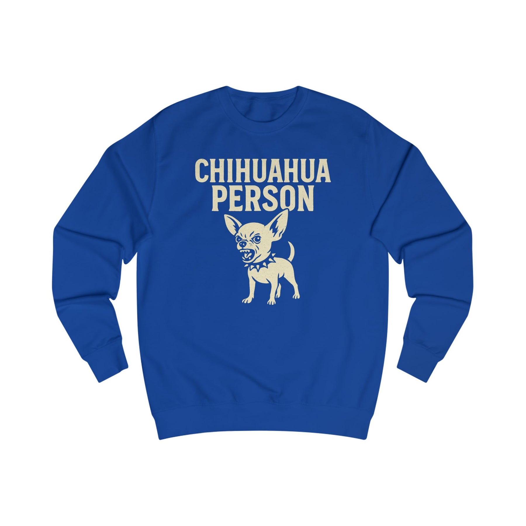 Zeigen Sie Ihre leidenschaftliche Liebe zu Chihuahuas mit diesem auffälligen T-Shirt mit Vintage-Grafik „Chihuahua Person“ . Mit einer cremefarbenen Schriftart im Used-Look und einer Illustration eines knurrenden Chihuahuas mit Stachelhalsband fängt dieses Shirt die perfekte Mischung aus Punkrock-Attitüde und Hundeliebhaber-Stolz ein.