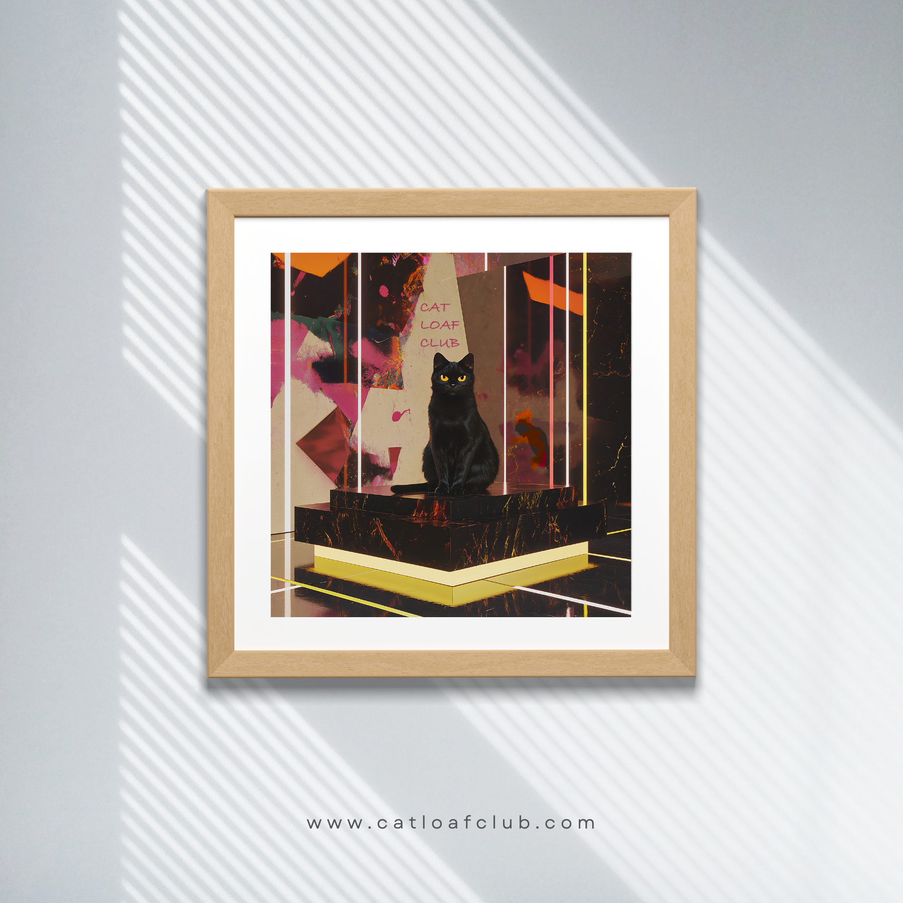 Descripción: Un elegante gato negro se reclina con gracia sobre una superficie de mármol blanco pulido, con su pelaje reluciente con sutiles reflejos. Acentos geométricos en dorado y negro mate rodean la escena, creando un equilibrio entre modernidad y lujo. El contraste del intenso pelaje ébano del gato con el mármol prístino irradia sofisticación, mientras que las líneas limpias y la decoración minimalista realzan el encanto contemporáneo de la obra. Perfecta para quienes aprecian la estética refinada con un toque de encanto felino.